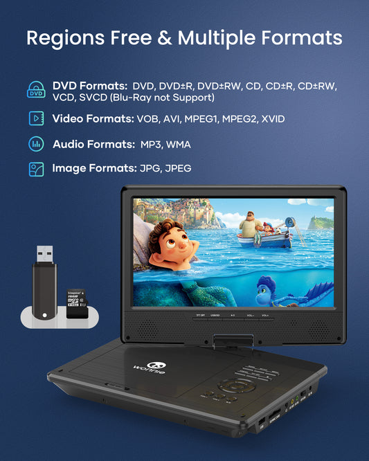 WONNIE 12.5" Portable DVD Player, Premium 10.5" HD Swivel Screen DVD Player for Kids, Built in 5 hours Rechargeable Battery Car DVD Player Support USB/SD Card/Sync TV (Car Headrest holder included)