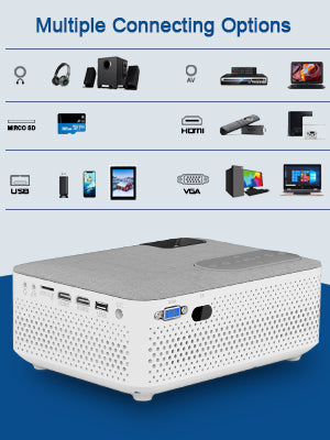 - 【COMPATIBLE DEVICES & Regions Free 】This portable projector is very versatile and has HDMI, AV, VGA, SD Card port, which allows you to use it with Laptop, PCs, TV Box, Amazon Fire TV Stick, Roku, Chrome Book, Tablets, Blue-ray DVD player, SD Card, USB Flash Drive, Media players (Music, Pictures, Video), iPad, iPhone, Android Smartphones. with US/EU/UK AC adapter, you can use it all arround the world.