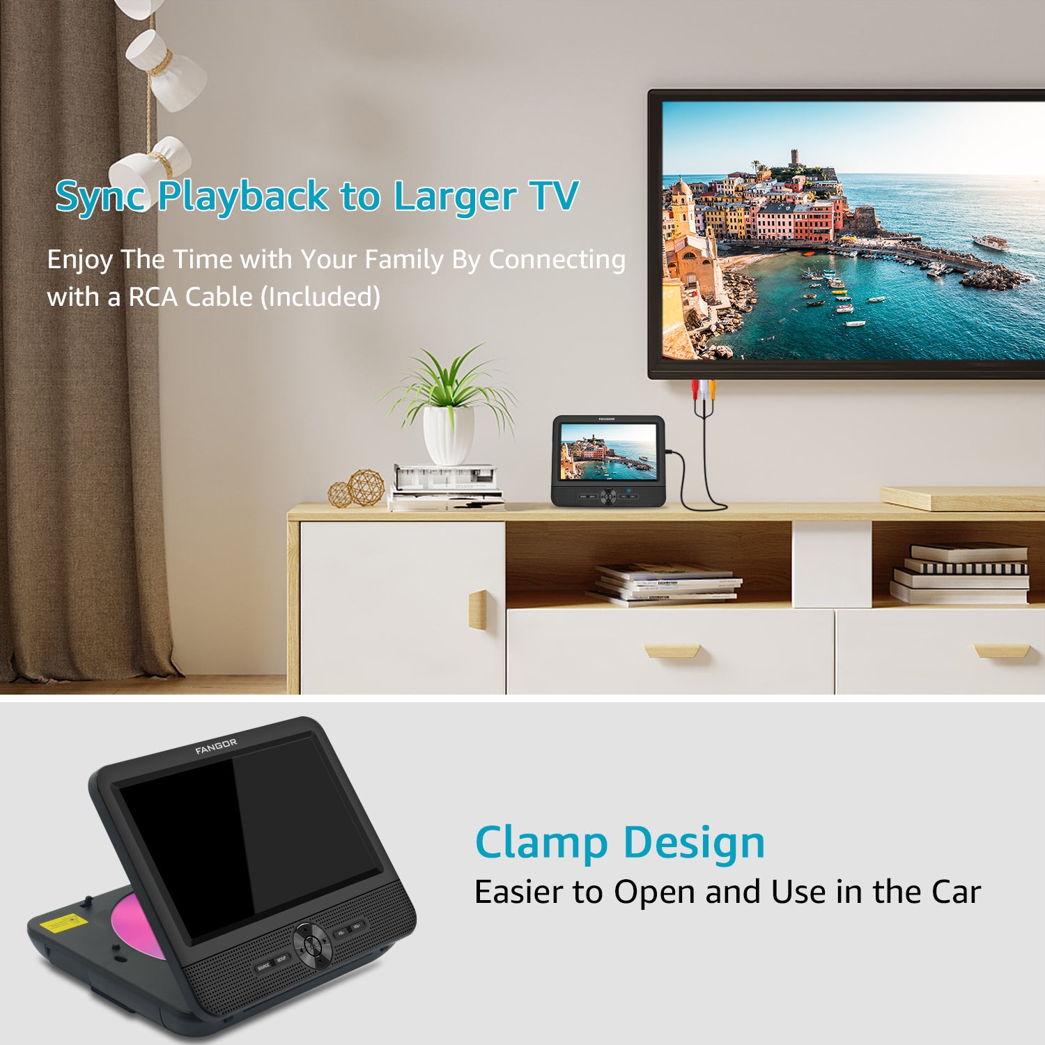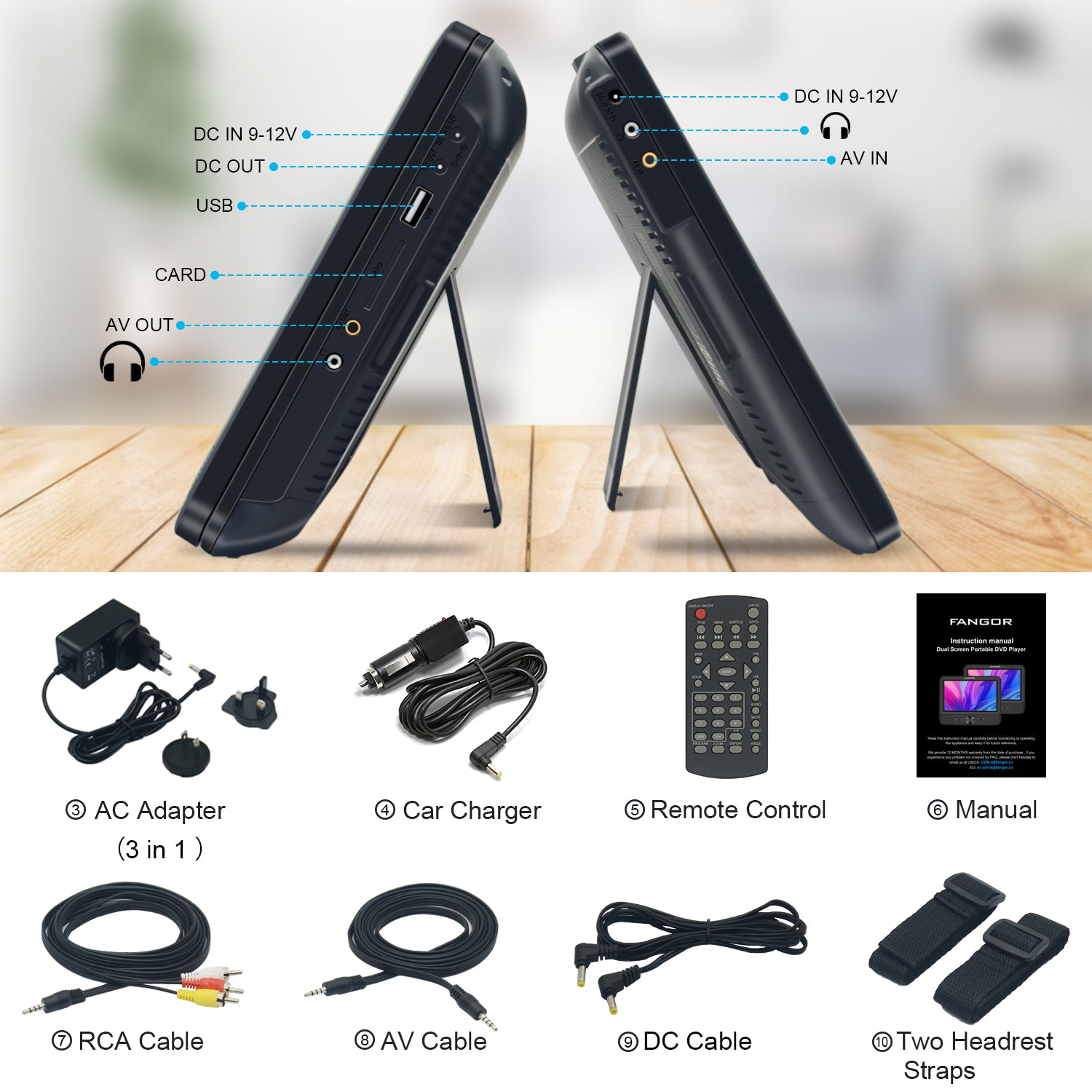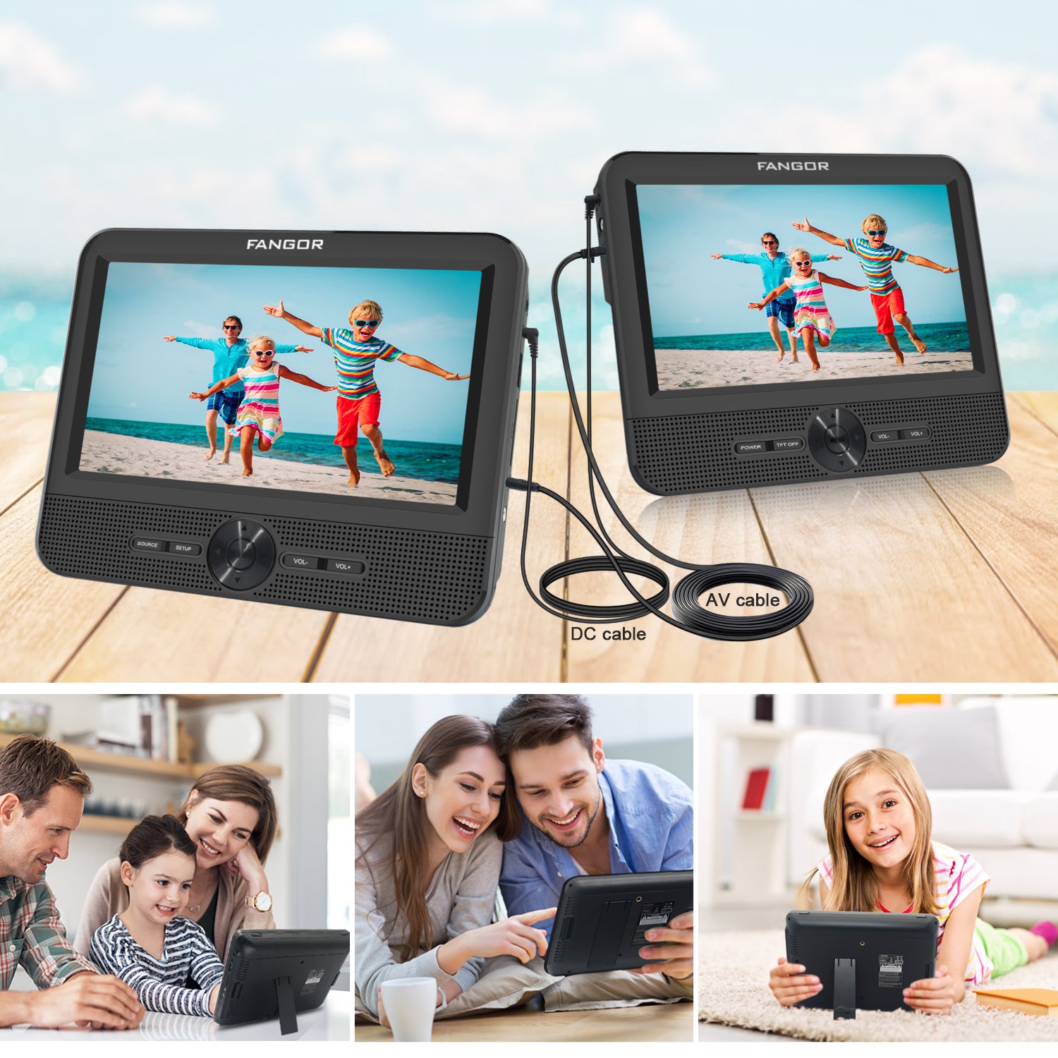 1.FANGOR dual dvd players made of one player and one LCD screen, they will play a same movie simultaneously via simply DC and AV cable connecting.