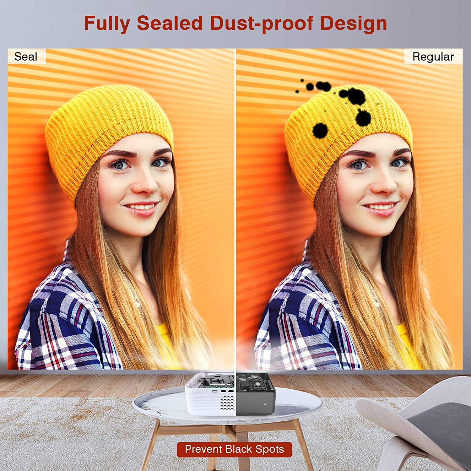The sealed optical machine: Advanced fully sealed optical components design avoid dust falling on the LCD screen to ensure no black spots on the projection image. Make sure lower noise than other ordinary LED projectors on the market. The most advanced copper radiator to make sure cooling performance better than regular projectors. This is the most advanced design of anti-dust, lower noise and cooling system.