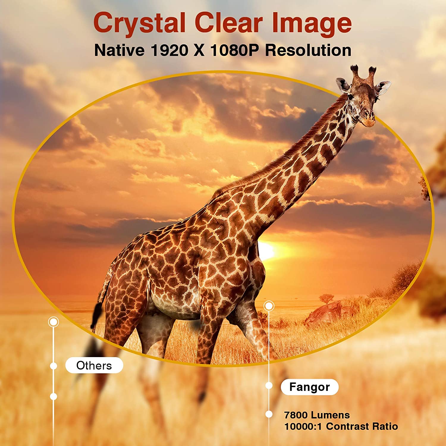 - With 10000:1 contrast ratio and native 1920x1080 resolution, 200 ANSI Lumens bring home the most cozy images and outstanding color accuracy for Home Theater, Outdoor Movies, Games, Graphics. FANGOR native 1080P full HD projector supports 4k video, which brings you crystal clear and satisfactory image, 80% sharper than other 1080p projectors.