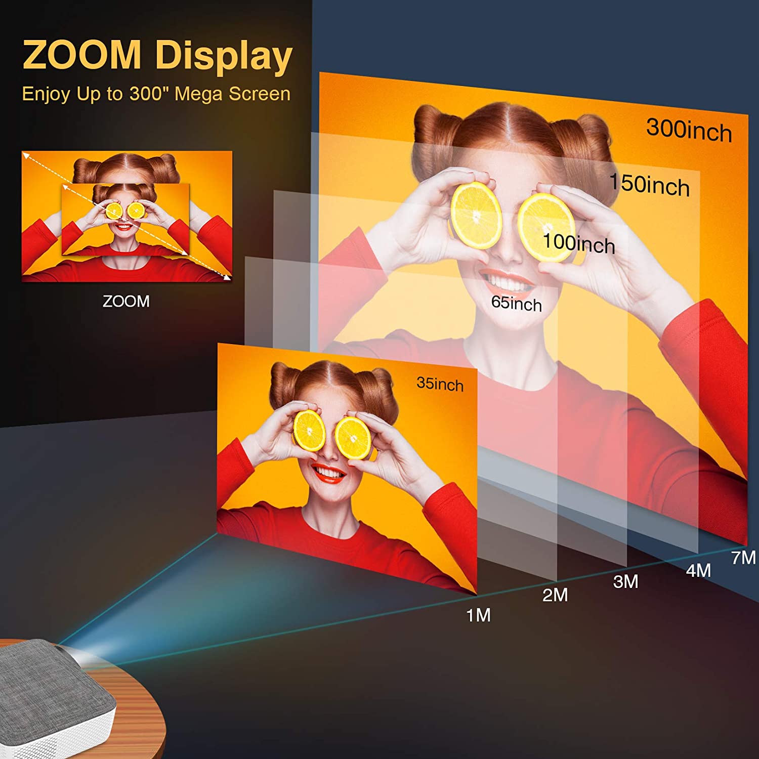Brightness: 7800 Lux, Contrast Ratio: 10000: 1, Native Resolution: 1920x1080 Pixels(Support playing 4K videos), Lamp Life: 100,000 hours, Projection Size: 35"-300" Inches, Digital Zoom: 50%-100%(Scale 0-10), Aspect Ratio: 4: 3/16: 9/Auto, Digital Keystone: ±45°, Light Source Type: LED
