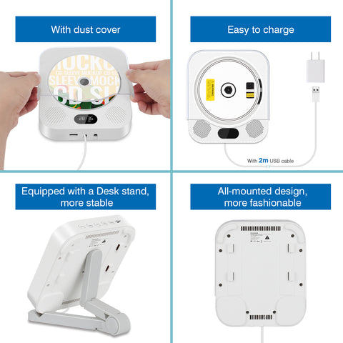 【Elegant Design & Wall Mountable】Comes with wall-mounted kit and creative pull switch design, makes it easier to be mounted on the wall, easy to install on the wall or stand on the desktop, you can place the CD player in the living room, dining room, bedroom, gym or wherever you prefer. Designed with dust cover and one plays all multiple functions of remote control.